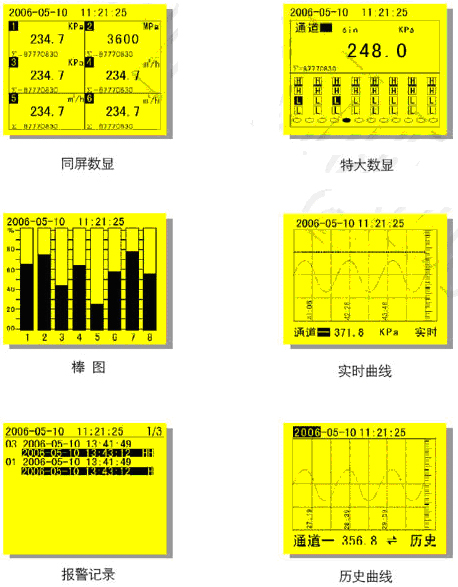 ◆報警顯示,同時指示各路通道的下下限、下限、上限、上上限報警。可以記錄zui近的15條報警信息;